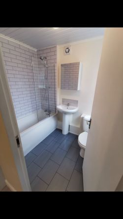A good sized bathroom that benefits from having a large window making for a light/ neutral theme creating a clean spacious feel. The bathroom also has new tile effect flooring and a new three piece bathroom suite with a shower over the bath.